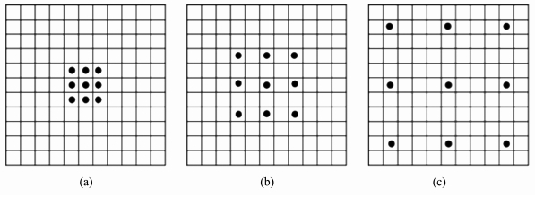 在经典的卷积神经网络中,卷积核在连续的区域上滑动,而膨胀卷积在经典的卷积之上增加了一个膨胀宽度,在进行卷积操作时会跳过膨胀宽度中间的数据,卷积核的大小保持不变,这样一个同样大小的卷积核就能够获得更广的输入矩阵数据,增大了卷积核的感受视野。膨胀卷积示意图见图5。这3张图分别表示3层叠加的卷积操作,其中图(a)是正常卷积操作,卷积核大小为3×3;图(b)卷积的膨胀宽度为2,在(a)卷积之上,那么感受视野增大为7×7;图(c)中膨胀宽度为4,在(b)卷积操作之上,此时卷积感受视野相当于扩大为15×15。