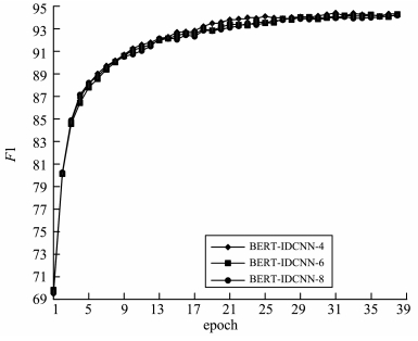 BERT -IDCNN-CRF模型随着训练轮数F1值变化如图6所示,测试了不同卷积核个数对模型的影响。BERT -IDCNN-CRF-10中的数字10表示卷积核的个数为10,其他模型以此类推。实验中除卷积核个数外,其它参数保持不变。实验表明随着卷积核的个数的增加,F1值呈现缓慢增加的趋势,其中效果最好的模型为BERT-IDCNN-F100模型,卷积核的个数为100,在第33个epoch的时候达到最大F1值,最大F1值为94.41%。实验中发现,随着卷积核个数的增加,训练时间不会出现明显的变化,这得益于卷积操作在GPU中能够并行计算,缩短了计算时间,其中BERT-IDCNN-F100在第7 128 s时得到最优模型。